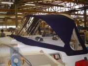 2 arcos de acero inoxidable Ø 22 mm. 1 lienzo con techo, parabrisas en 3 paneles de vidrio (incluyendo el panel central de apertura), 1 par de mejillas de vidrio. Conexión de la tela sobre la cubierta por slings sobre carriles de aluminio + tenax. Tensión de las mejillas por correas de triángulo.
