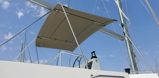 Les toiles permettent de fermer le cockpit et de créer un espace de vie supplémentaire. Les panneaux sont roulables. La fermeture de descente est intégrée à l'ensemble.